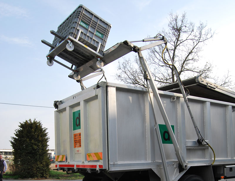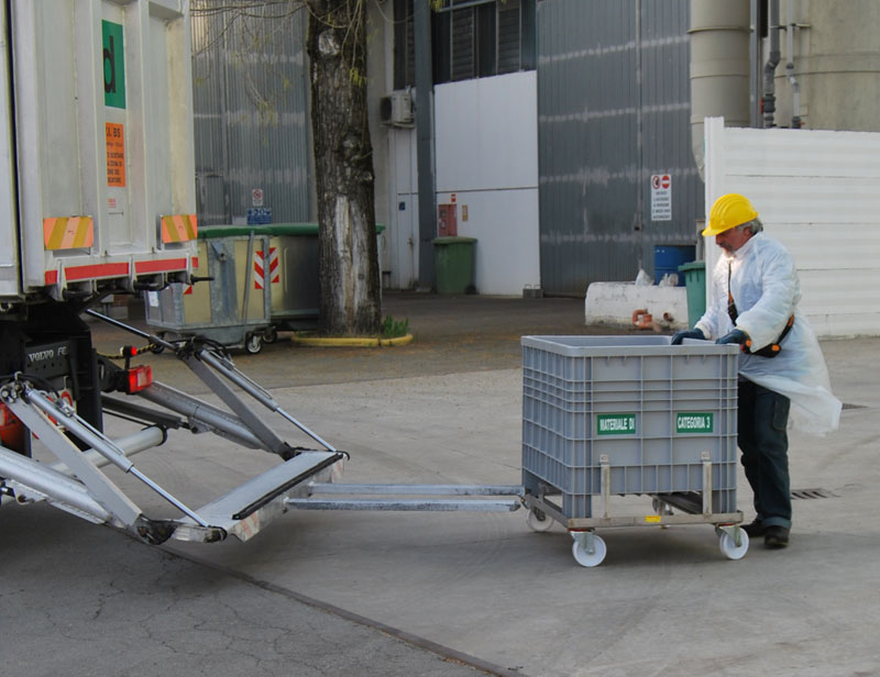 Da veicoli con pianale e sponda idraulica ideali per piccoli spazi, disponiamo altresì di autocarri con caricatore posteriore opportunamente predisposti per sollevare meccanicamente contenitori in plastica alimentare (forniti su richiesta in vendita o in comodato d'uso) muniti di ruote.